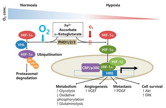 Oxygen-dependent regulation of HIF-1α in cancer cells. Under normoxia, HIF-1α is recognized and hydroxylated by PHD in the presence of Fe2+, ascorbate, and α-ketoglutarate. Hydroxylated proline in HIF-1α is recognized by VHL and subsequently ubiquitinated for proteasomal degradation. However, under hypoxic conditions, HIF-1α is stabilized and translocated into the nucleus, where it is dimerized with HIF-1β. Following the binding of the HIF-1α-HIF-1β complex with other cofactors (such as CBP/p300), the molecules can target the HRE, which is involved in the metabolic switch, angiogenesis, metastasis, and cell survival. Abbreviations: CBP, cAMP response element binding protein; HRE, hypoxia response elements; p300, E1A binding protein; PHD, proxyl hydroxylase protein; Ub, ubiquitin; VHL, von Hippel–Lindau protein.