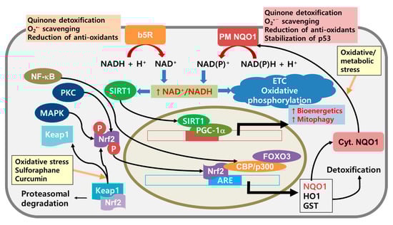Redox homeostasis and metabolic shift through activation of the Nrf2-Keap1 pathway and regulation of the NAD+/NADH ratio by PM redox enzymes. Disulfide bonds between Nrf2 and Keap1 are broken by oxidative stress and other Nrf2 activators. Activated Nrf2 is translocated into the nucleus, combined with CBP/p300 and FOXO3, and bound to ARE, which results in the expression of detoxifying enzymes. Under further oxidative/metabolic stress, expressed cytosolic NQO1 can be translocated into the inner surface of the PM. A high NAD+/NADH ratio is induced by stimulating b5R and PM NQO1 to activate SIRT1-PGC-1α signaling and enhance mitochondrial bioenergetics. Abbreviations: ARE, antioxidant response element; CBP, cAMP response element binding protein; Cyt. NQO1, cytosolic form of NADH-quinone oxidoreductase 1; FOXO3, Forkhead family of transcription factor 3; GST, glutathione S-transferase; p300, E1A binding protein; p53, tumor suppressor encoded by TP53; PKC, protein kinase C; PM NQO1, plasma membrane bound NQO1; PGC-1α, peroxisome proliferator-activated receptor-γ coactivator).