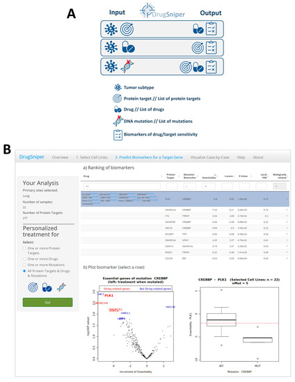Screenshot of the DrugSniper web application. (A) Potential applications of the tool. DrugSniper predicts putative drugs and protein targets for a tumor type with their predictive biomarkers for four different inputs: (i) a set of targets and a tumor type, (ii) a set of drugs and a tumor type, (iii) a set of mutations and a tumor type and (iv) only the tumor type. (B) Example of the interactive web-application DrugSniper in small cell lung cancer cell lines (n = 22). The table shows the ranking of drugs and their protein targets with their corresponding predictive biomarkers. See Table 1 legend to acquire more information about the table’s columns. (Down-left plot) volcano plot showing the highlighted row in the table (PLK1-CREBBP) in bold red and top essential genes that depend on the mutational status of CREBBP. If CREBBP is mutated, the PLK1 gene is essential for small cell lung cancer (SCLC) cells’ viability, suggesting that CREBBP is a good predictive biomarker of PLK1 essentiality. (Down-right plot) box plot showing PLK1′s essentiality score (DEMETER score) regarding CREBBP mutational status. PLK1 is essential for CREBBP-mutant cell lines. The dotted red line represents the −2 DEMETER score threshold (which is the essentiality threshold proposed by DEMETER’s authors).