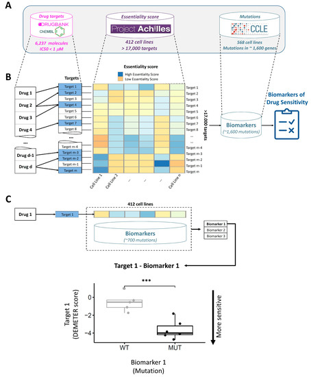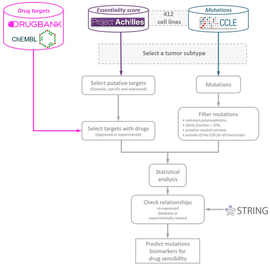 Project Achilles interrogated these 412 cell lines for gene essentiality using RNAi screens. From that basis, the DEMETER score was created to quantify the competitive proliferation of the cell lines and minimize the effect of off-target hybridizations by using a statistical model. We used the DEMETER score as a measure of essentiality. The more negative the DEMETER score is, the more essential a gene is for a given cell line. Authors of DEMETER established a cut-off of −2 in this score as a threshold of essentiality. Genes with a DEMETER score lower than this threshold can be considered essential for a cell line. Missing scores of DEMETER were imputed using the nearest neighbor averaging algorithm [52]. Combining these data with drug information databases and mutational profiles, we developed a statistical pipeline to find predictive biomarkers of targeted drugs (Figure 4).