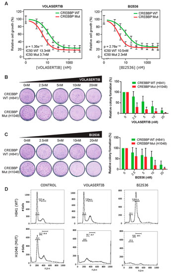 Sensitivity to PLK1 inhibitors was also measured using a colony formation assay. The CREBBP mutated (CREBBP-MUT) cell line NCI-H1048 reduced its ability to form colonies significantly after exposure to 2.5 nM of Volasertib (p = 7.24 × 10−12) and 5 nM of BI2536 (p = 9.37 × 10−7), showing a significant global effect of both inhibitors (p = 4.84 × 10−14). In contrast, the CREBBP wild-type (CREBBP-WT) cell line NCI-H841 was more resistant to Volasertib or BI2536 treatment (Figure 3B,C). Additionally, we conducted a cell cycle analysis by FACS after 24 h of treatment with 5 nM of Volasertib or BI2536 in NCI-H841 and NCI-H1048 cells (Figure 3D). There was a minor cell cycle G2M arrest after Volasertib exposure in the CREBBP-WT NCI-H841 cells. In contrast, CREBBP-MUT cells NCI-H1048 showed a completely disrupted cell cycle after both Volasertib and BI2536 treatment at low concentrations. The arrest became more significant after BI2536 treatment. These experiments strongly support the hypothesis that SCLC cell viability is significantly different depending on the mutational status of the CREBBP gene.
