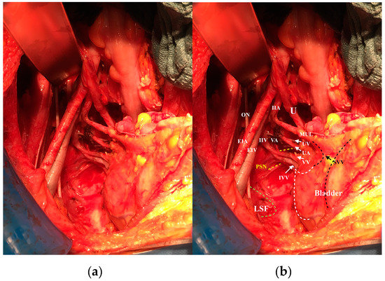 The lateral parametrium and paracolpium after removing the lymph nodes and fat tissue: (a) original photo; (b) with explanation of anatomic structures: U: ureter, MUL: medial umbilical ligament, IIA: internal iliac artery, IIV internal iliac vein, EIA: external iliac artery, EIV: external iliac vein, ON, obturator nerve, IVV: inferior vesical vessels (the dotted white line shows the distribution of these vessels in the bladder wall), SVV: superior vesical vessels (dotted black line shows the distribution of these vessels in the bladder wall), UV: uterine vein, UA: uterine artery, VV: vaginal vein, VA: vaginal artery, PSN: pelvic splanchnic nerves, LSF: lesser sciatic foramen.