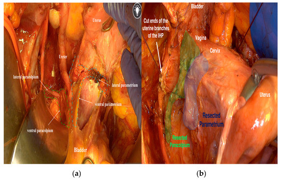 - Yabuki, Y.; Asamoto, A.; Hoshiba, T.; Nishimoto, H.; Nishikawa, Y.; Nakajima, T. Radical hysterectomy: An anatomic evaluation of parametrial dissection. Gynecol. Oncol. 2000, 77, 155–163. [Google Scholar] [CrossRef] [PubMed]
