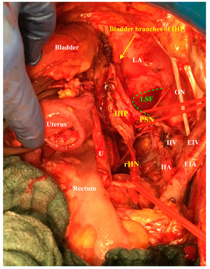 Therefore, it is essential to emphasize the accurate identification of all the components of the autonomic nerve system, especially while attempting a nerve-sparing radical hysterectomy procedure, complying with only the resection of the uterine branches and the dissection of the endopelvic fascia directly at the level of the first bladder branch of the inferior hypogastic plexus [11,12,14] (Figure 5).