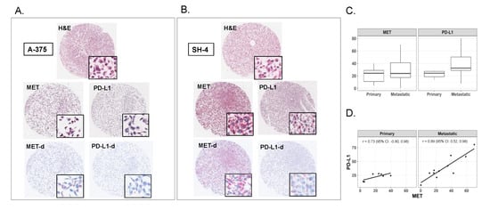 Histopathology images of MET and programmed death-ligand 1 (PD-L1) expression levels in a representative primary melanoma (A-375, panel A) and a metastatic melanoma (SH-4, panel B) cell lines. Hematoxylin and eosin (H&E), MET, and PD-L1 immunostained slides from the cell microarray (CMA) are represented (full cores, 4×; insets, 40×), as well as color-deconvolved images for MET (MET-d) and PD-L1 (PD-L1-d). Boxplot with the box representing the interquartile range and a dark line representing median MET and PD-L1 in seven primary melanomas and 11 metastatic melanomas (C). Correlation of MET and PD-L1 in primary and metastatic cell lines, with Pearson’s r values and 95% confidence interval (D).