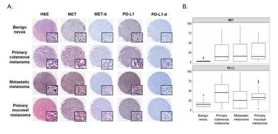 MET and PD-L1 expression in a representative benign nevus, primary cutaneous melanoma, metastatic melanoma, and primary mucosal melanoma. Hematoxylin and eosin (H&E), MET, and PD-L1 immunostained slides from the tissue microarray (TMA) are represented (full cores, 4×; insets, 40×), as well as color-deconvolved images for MET (MET-d) and PD-L1 (PD-L1-d) (panel A). Boxplot with the box representing the interquartile range and a dark line representing median MET and PD-L1 in benign nevi, primary cutaneous melanoma, metastatic melanoma, and primary mucosal melanoma (panel B).