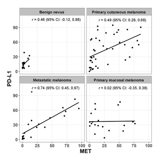 Correlation of MET and PD-L1 in benign nevi, primary cutaneous melanoma, metastatic melanoma, and primary mucosal melanoma, with Pearson’s r values and 95% confidence interval.