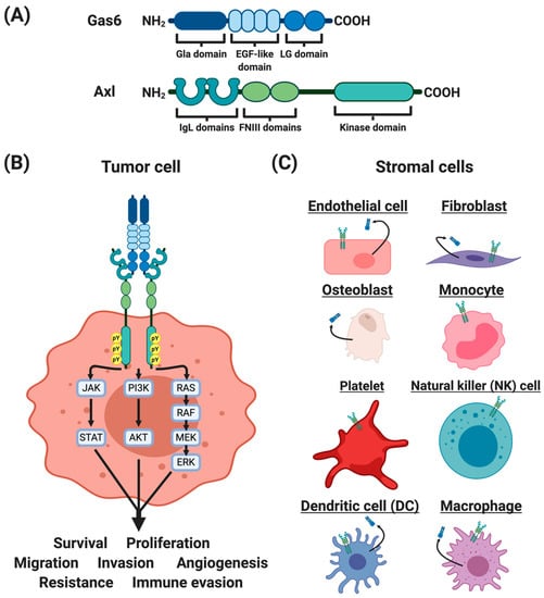 Structures and expression profiles of Gas6 and Axl. (A) The growth arrest specific 6 (Gas6) protein belongs in the family of vitamin K-dependent proteins. Gas6 consists of a gamma-carboxyglutamic acid (Gla) domain, four epidermal growth factor (EGF)-like domains, and two laminin G (LG)-like domains. Axl belongs in the Tyro3, Axl, MerTK (TAM) subfamily of the receptor tyrosine kinases. Axl consists of immunoglobulin-like (IgL) domains, two fibronectin domains, and a kinase domain. (B) Axl is expressed in a number of tumor types. The Gas6/Axl signaling promotes tumor cell survival, proliferation, migration, invasion, angiogenesis, therapeutic resistance, and immune evasion. (C) Gas6 and Axl are expressed by host stromal cells, including endothelial cells, fibroblasts, osteoblasts, monocytes, platelets, natural killer (NK) cells, dendritic cells (DCs), and macrophages.