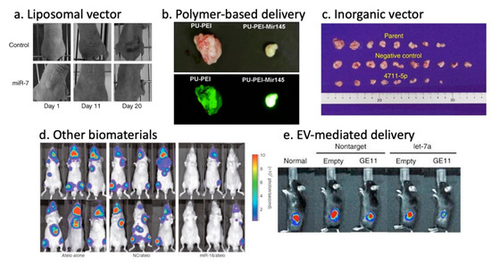 Potent anti-tumor effects of miRNA therapy through various delivery methods. (a) Local liposome-miR-7-plasmid treatment of xenograft mice [73]. (b) In vivo tumorigenicity assessment of polyurethane-short branch polyethylenimine (PU-PEI)-mediated miR-145 delivery to patient-derived Glioblastoma (GMB) cells [78]. (c) Tumor sizes of xenograft mice after systemic super carbonate apatite (sCA)-mediated miR-4711-5p delivery [84]. (d) Inhibition of metastatic tumor growth in bone tissues by the atelocollagen-mediated miRNA treatment [93]. (e) Inhibition of breast cancer development in vivo using GE11-positive exosomes containing let-7a [91].