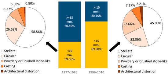 The percentage of breast cancer cases by different mammographic features and tumor size for each of the two periods is shown in Figure 1. The percentage of small breast tumor (<15 mm) in the second period (1996–2010) was almost double of that in the latter period. Among these small tumors, the percentage of powdery, crushed stone-like, casting and architectural distortion in the second period was almost double compared to that in the first period.
