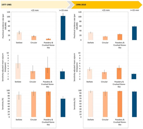 The MST was longest for the stellate masses, followed by the powdery and crushed stone-like calcifications and the circular masses. The shorter MST for breast tumors larger than 15 mm was seen. In the period between 1977 and 1985, the estimate of sensitivity was lower for stellate masses compared with other types of small breast tumor, but it was even lower for breast tumors of size 15 mm or larger as the cutoff of a large tumor here is not based on 2 cm or larger as defined in the conventional manner.