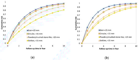 Information on the MST for each type of mammographic appearance can be used to predict the risk of transition to symptomatic disease in the absence of early detection measures. For small breast cancers, the circular masses had the most rapid progression and closer to that of breast cancers of size 15 mm or larger (see Figure 3a). Such a finding provides information on medical consultation when women were detected with breast cancer with different types of mammographic appearances. In addition, knowing a specific type of mammographic appearance also provides guidance for the future surveillance of women diagnosed with breast cancer, particularly small breast cancer [,,]. If the tumor appears as a circular mass, a more intensive surveillance schedule is required, and further biomarker tests might be required, with a view to providing a further individually tailored therapy. In contrast, small breast cancers appearing as stellate masses or powdery and the crushed stone-like calcifications could be less aggressively managed, in order to avoid overtreatment.