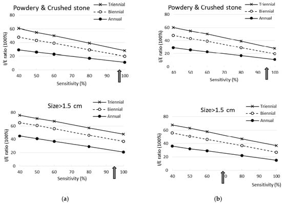 Using the parameters estimated from Figure 2 in the second period (1996–2010), Figure 3a (see the indicated points by arrows; the details of numerical values also see the bottom panel of Table 1) shows the percentages of I/E ratio for the stellate type were 23% and 32% for the biennial and triennial program, respectively. The corresponding figures were 32% and 43% for the circular type and 21% and 29% for powdery and crushed stone-like calcifications. In spite of longer MSTs, the similar findings on the percentage of the I/E ratio were also noted in the first period (Figure 4b).