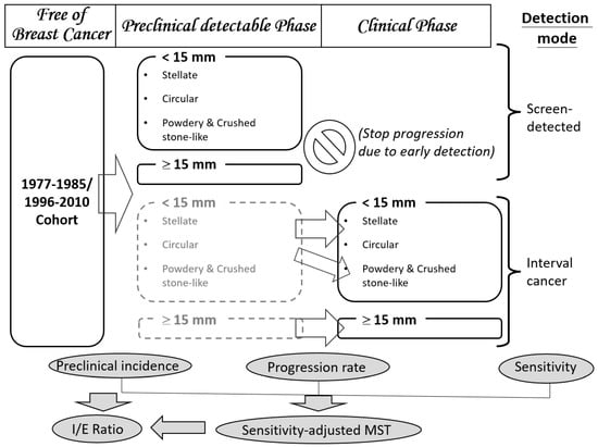 A number of previous studies have elucidated the temporal natural history of breast cancer, free of breast cancer, PCDP, clinical phase (CP) [,,,] and the extended process with the incorporation of tumor attributes such as node status [,,] by modeling the average duration between PCDP and CP, named as the mean sojourn time (MST) [,,]. However, little is known about the temporal natural history stratified by mammographic features that have been regarded as an independent predictor for the prognosis of breast cancer [,]. Moreover, due to the widespread use of mammography screening for breast cancer, elucidating the natural history of breast cancer by mammographic features with emphasis on breast tumors less than 1–14 mm is of paramount importance [,,]. The recently proposed classification of breast cancer by the anatomic site of cancer origin also revealed the two types of breast cancer, acinar adenocarcinoma of the breast (AAB) and ductal adenocarcinoma of the breast (DAB) []. The origin of the former is derived from TDLU of acinar whereas the origin of the latter is derived from the duct of breast. The AAB type, including the stellate type, the circular type, the powdery type, and the crushed stone-like type, can be prevented by early detection through mammography, but the latter had poor prognosis and may not be amenable to early detection through screening [,]. Among AAB, the stellate type, the powdery type, and the crushed stone-like had better prognosis than the circular type [].