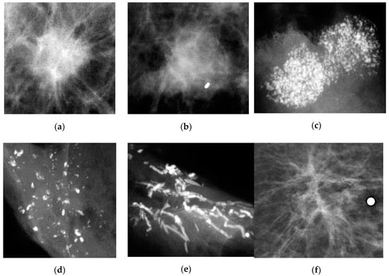 Types of mammographic appearance including Stellate, Circular, Powdery, Casting, Crushed stone-like and Architecture distortion. (a) Stellate; (b) Circular; (c) Powdery; (d) Crushed stone-like; (e) Casting; (f) Architecture distortion.