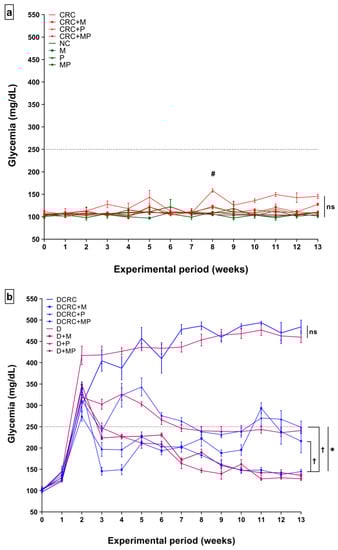 All animals belonging to the groups where diabetes was not induced, i.e., in groups NC, CRC, CRC + M, CRC + P, CRC + MP, M, P, and MP, had glycemia levels below 250 mg/dL at all time points and the difference between these groups was not statistically significant (ns) as shown in Figure 1a. However, in the CRC group, whose animals were not subjected to diabetes induction by STZ, high glycemia peaks were observed in weeks 3, 5, 8, and 11 in which Dextran sulfate sodium (DSS) was administered. These blood sugar fluctuations were only significant at week 8 when comparing normal controls (NC) to the CRC group. The metformin and probiotics (MP) combination significantly reduced the peaks at week 8 (CRC + MP versus CRC, # p < 0.05) as shown in Figure 1a.