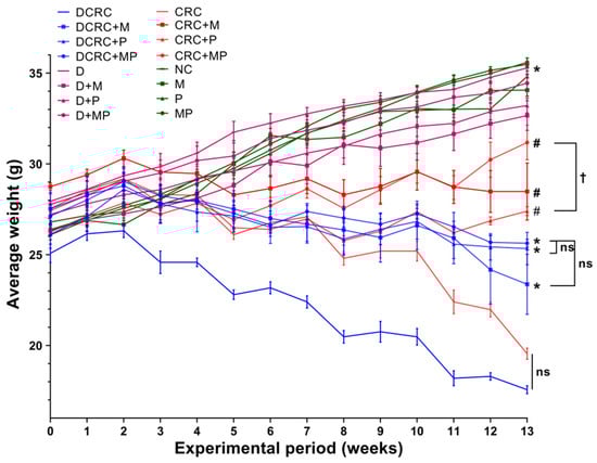 Weight changes in the different animal groups during the experimental period. Data are shown as mean ± SEM with n = 6 animals per group. Statistical significance was expressed at week 13 by # p < 0.05 in nondiabetics when compared to their experimental CRC control (CRC) and by * p < 0.05 in diabetics when compared to their experimental diabetic CRC control (DCRC). Moreover, when comparing only two groups, connecting lines were used to indicate the compared groups with † p < 0.05.