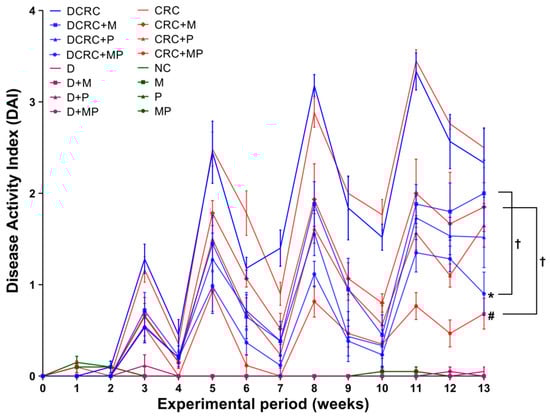 Weekly Disease Activity Index (DAI) variations among the different groups. Note that animals that were not subject to the induction of CRC had very low indexes, close to zero. However, an increase in DAI was obtained in the groups with CRC induction, with peaks obtained at week 3, 5, 8, and 11. M and P treatments elicited a reduction in DAI. Statistical significance was expressed by # p < 0.05 in nondiabetics when compared to their experimental CRC control (CRC), and by * p < 0.05 in diabetics when compared to their experimental diabetic CRC control (DCRC). Moreover, when comparing only two groups, connecting lines were used to indicate the compared groups with † p < 0.05.