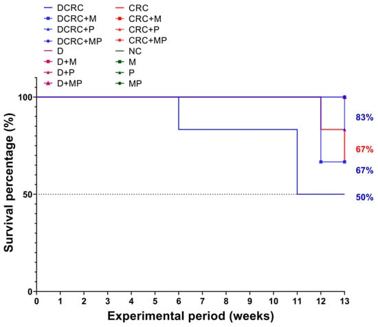 When looking at fecal occult blood, normal controls and groups that were not subjected to CRC induction (NC, D, M, D + M, P, D + P, MP and D + MP groups) showed negative occult blood for all animals at all time points. Groups that were subjected to CRC induction showed positive results for fecal blood to varied degrees. CRC and DCRC animals were the first to show blood in their stools in 17% of the animals starting week 3 (on the first DSS administration), to reach 100% by the end of the experiment (Table 1).