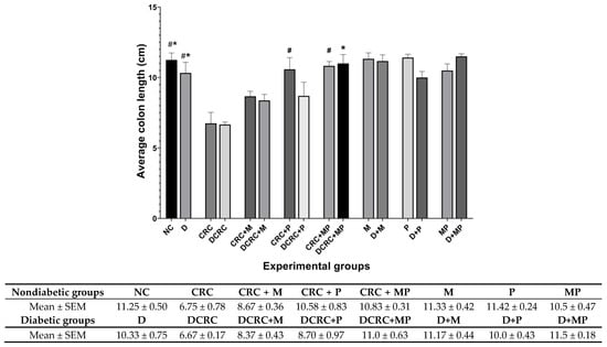 Colon length variation. Average colon length (cm) was recorded on the day of sacrifice at week 13 Nondiabetic groups were compared to their experimental CRC control (CRC), significance was expressed by # p < 0.05. On the other hand, diabetic groups were compared to their experimental diabetic CRC control (DCRC), and significance was defined as * p < 0.05, with n = 6 animals per group.