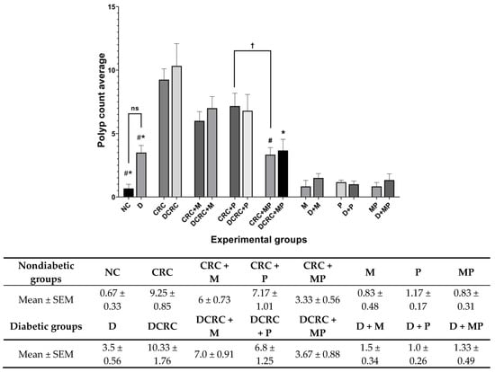 Polyp count variation in the different groups. Average polyp number was recorded on the day of sacrifice at week 13. Nondiabetic groups were compared to their experimental CRC control (CRC). Significance was expressed by # p < 0.05. On the other hand, diabetic groups were compared to their experimental diabetic CRC control (DCRC). Significance was expressed by * p < 0.05. Moreover, when comparing only two groups, connecting lines were used to indicate the compared groups with † p < 0.05, (ns) stands for nonsignificant, with n = 6 animals per group.