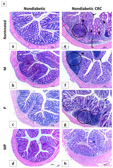 Nondiabetic animals that were subjected to CRC induction had survival rates of 67%; while the same animals treated with M and P alone or in combination (CRC + M, CRC + P, and CRC + MP groups) had 100% survival rates, similar to normal animals in the normal controls (NC) and in nondiabetic M, P, and MP groups (Figure 4).