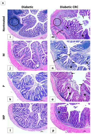 Effect of probiotics and metformin on colon histology. (A,B) Representative images of hematoxylin and eosin (H&E)-stained colon sections illustrating the histological changes in the nondiabetic (Panel A) and diabetic (Panel B) groups. The worst alterations were encountered in the nontreated CRC (7A-e) and diabetic CRC (7B-m). Note the presence of large inflammatory cells infiltrates (circle), inflammatory cells invading the edematous submucosa (bracket), crypt abcess (black triangle) and cryptitis (black arrow), as well as crypt architecture disarray (star). Significant improvements in the combination treated mice in groups CRC + MP (7A-h) and DCRC+MP (7B-p) were noted. Original magnification: 4×; scale bars 100 µm. Photos were adjusted for white balance using Adobe Photoshop®; (C) Histological alterations score. Data is expressed as average ± SEM (n = 6). Nondiabetic groups were compared to their experimental CRC control (CRC), significance was expressed by # p < 0.05. On the other hand, diabetic groups were compared to their experimental diabetic CRC control (DCRC), significance was expressed by * p < 0.05. Moreover, when comparing only two groups, connecting lines were used to indicate the compared groups with † p < 0.05; (ns) stands for nonsignificant.