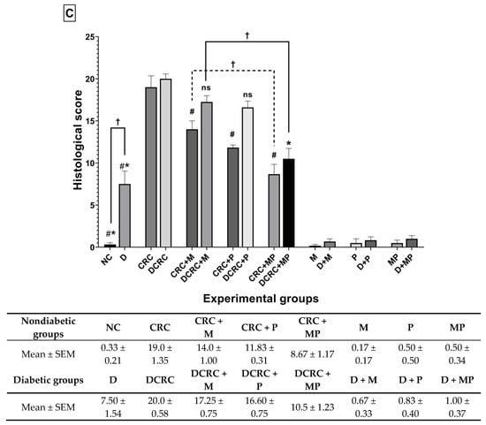 In the CRC and DCRC groups, animals had the highest disease activity indexes (Figure 3). Treatment of CRC animals with M alone or P alone ameliorated the clinical profile of the animals and decreased DAI, but not significantly. Importantly, the combined MP treatment induced a statistically significant decrease in DAI levels in nondiabetic CRC and diabetic CRC (# p < 0.05 and * p < 0.05, respectively), as these groups (CRC + MP and DCRC + MP) had the lowest DAI along with a better mobility, fur shape, and responsiveness. The addition of P to M induced a significant amelioration in its action on decreasing DAI in nondiabetics (CRC + M versus CRC + MP, † p < 0.05) and in diabetics (DCRC + M versus DCRC + MP, † p < 0.05) at week 13 (Figure 3).