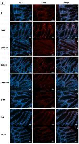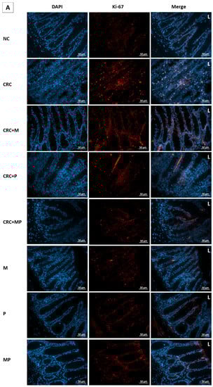 To assess the effect of metformin and probiotics on cell proliferation, immunostaining by Ki-67 was performed on paraffin-embedded colon tissue. The highest proliferation indices were observed in CRC and DCRC groups, whereby the ki-67 staining was distributed throughout most of the crypt area, towards the lumen (Figure 8).