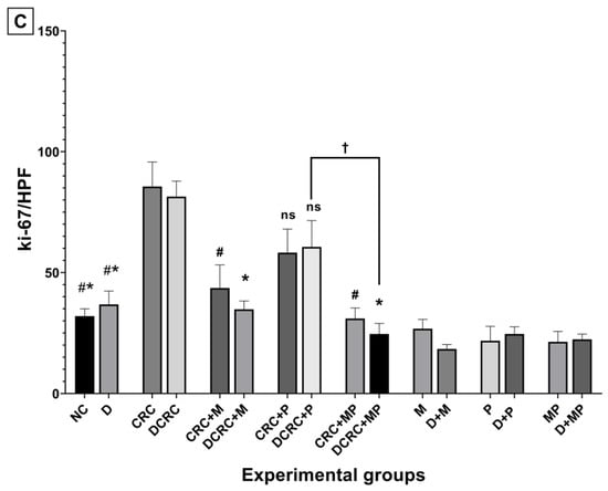 The structural improvement between treatment with metformin alone (CRC + M, DCRC + M) and metformin with probiotics in the CRC + MP and DCRC + MP groups was statistically significant, † p < 0.05 (Figure 7C). One possible explanation could be that the dysregulated microbiota in CRC could prevent metformin from exerting its protective effects. Correction of this dysbiosis with probiotics proved to be crucial in regulating the anti-inflammatory and anticarcinogenic mechanism of action of metformin.