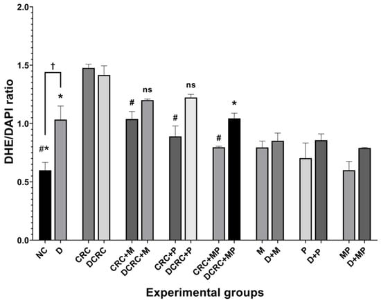 On the other hand, diabetic animals with CRC showed a significant reduction in their DHE/DAPI ratios only when the combination protocol was adopted in the DCRC+MP group (Figure 9).