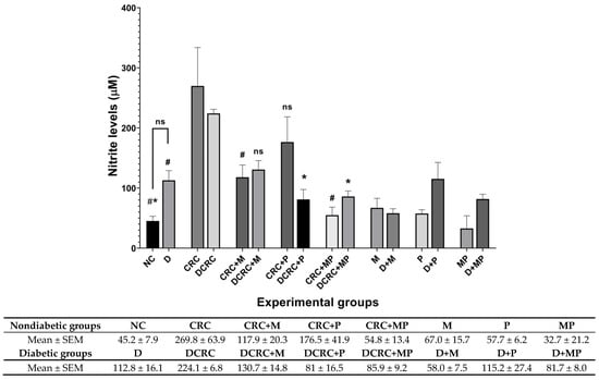 Nitrite modulation by metformin and probiotics. Results are expressed as mean ± SEM (n = 4). Nondiabetic groups were compared to their experimental CRC control (CRC), significance was expressed by # p < 0.05. On the other hand, diabetic groups were compared to their experimental diabetic CRC control (DCRC); significance was expressed by * p < 0.05; ns stands for nonsignificant.