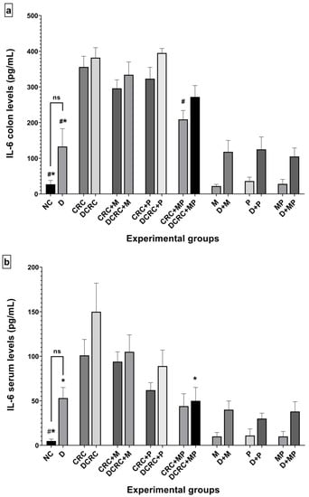 Importantly the MP combination significantly reduced the IL-6 levels in the colon of nondiabetics (CRC + MP, # p < 0.05) and the serum of diabetics (DCRC+MP, * p < 0.05), as seen in Figure 11a,b.