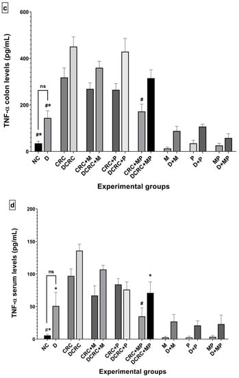 In addition, TNF-α levels were also significantly reduced in both colon and serum of nondiabetics with CRC as seen in Figure 11c,d (CRC + MP, # p < 0.05), and only in the serum of diabetics (DCRC + MP, * p < 0.05).