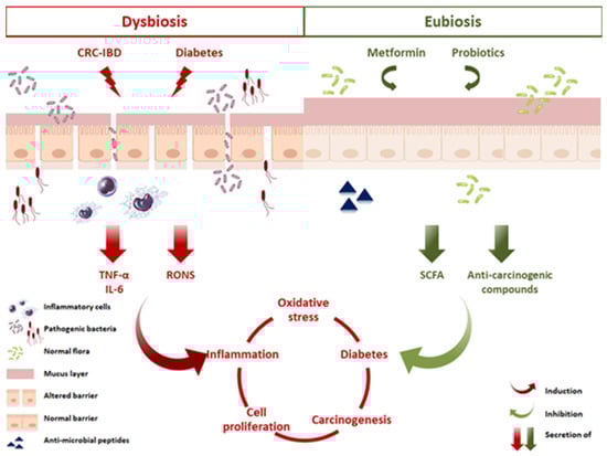 Proposed mechanisms of action elicited by metformin and probiotics in CRC and diabetes. An altered microbiota in a state of dysbiosis impairs the functions of the gut barrier by affecting the tight junctions and the mucus layer, thus facilitating the translocation of pathogens and toxins into the lamina propria. This invasion leads to recruitment of inflammatory cells, their activation, and the secretion of proinflammatory cytokines, including IL-6 and TNF-α. In parallel, an increase in RONS production induces a state of chronic inflammation, DNA damage, and increased cell proliferation, known as key players in CRC progression. Moreover, this state of chronic inflammation promotes insulin resistance and disurbance in glucose homeostasis, thus exacerbating diabetes and enhancing CRC. Probiotics and metformin administration, however, inhibited CRC progression, reduced inflammation, and ameliorated diabetes. These benefical effects are potentially linked to a restoration of the gut barrier, production of SCFA, antimicrobial peptides, regulation of hepatic glucose production, and modulating the balance between proliferation and apoptosis. The result of such a balanced miroenvironment is to preserve a dynamic intestinal barrier that controls and maintains homeostasis.