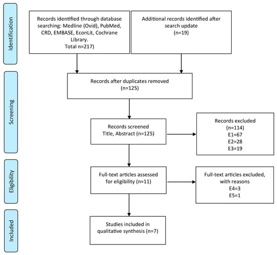PRISMA flow diagram for the process of literature search and exclusion: Electronic data bases were searched for cost-effectiveness studies evaluating endometrial cancer screening and/or prevention strategies. Numbers of excluded studies are listed for each reason of exclusion. Exclusion criteria: E1—other diseases than endometrial cancer or already have endometrial cancer, recurrent cancer or metastases; E2—studies evaluating cost-effectiveness of other interventions (e.g., therapy of endometrial cancer); E3—not decision-analytic modelling studies; E4—not full health-economic studies (cost-effectiveness studies); E5—editorials, reviews, abstracts; E6—not in German or English language.
