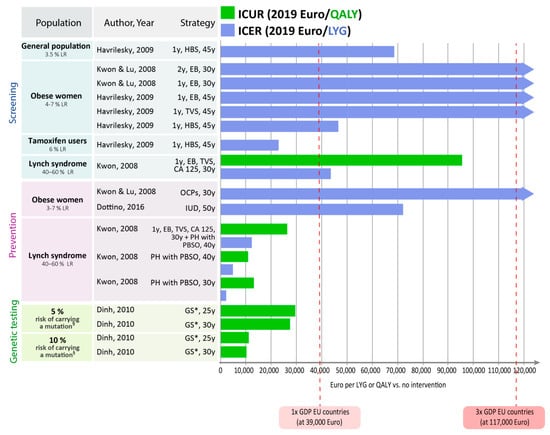 Application of oral contraceptives for five years in 30-year-old obese women (lifetime risk for endometrial cancer of 3%) to prevent endometrial cancer was not cost-effective with an ICER of 458,800 EUR/LYG compared with no intervention [18]. However, using Levonorgestrel intrauterine devices for five years in 50-year-old obese women (age-dependent lifetime risk for endometrial cancer between 4% and 7%) yielded an ICER of 72,000 EUR/LYG in comparison with usual care [16].