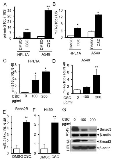 2.2. CSC Induces MiR-216b and Reduces Smad3 Expressions in Lung Epithelial Cells