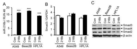 2.3. MiR-216b Inhibits the Expression of Smad3 in Lung Epithelial Cells