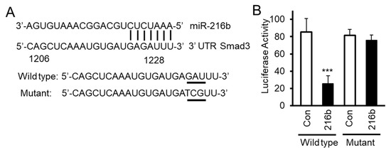 2.4. MiR-216b Inhibits Expression of Smad3 by Binding to Its 3′UTR