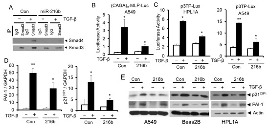 2.5. MiR-216b Attenuates TGF-β Signaling by Downregulating Smad3 Expression