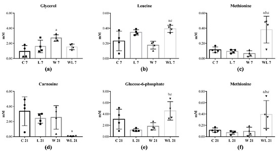 Among 42 skeletal muscle metabolites that were identified (Tables S1–S3), five were altered in rats euthanatised at 7th and 21st days of the experiment (Figure 1). Comparing both tumour-bearing groups with control groups, at day 7, glycerol increased in W7 in comparison to C7 group (Figure 1a) and leucine and methionine enhanced in WL7 in comparison to C7 and W7 groups (Figure 1b,c). At the 21st day, muscle carnosine content decreased in WL21 in comparison to C21 group (Figure 1d), but glucose-6-phosphate increased in WL21 in comparison to L21 and W21 groups (Figure 1e) and WL21 group also had a higher methionine content in comparison to C21, L21 and W21 groups (Figure 1f).