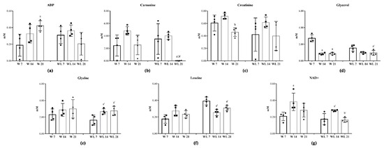 During the tumour evolution (Table S4), seven metabolites were modified in rats euthanatised at 7th, 14th and 21st days of the experiment as a time-course dependent related with/without modulation by leucine-rich diet (Figure 2). The muscle ADP content increased in W21 in comparison to W7 group but did not change in WL21 group (Figure 2a). Carnosine content in muscle was unchanged in the W group but deeply decreased in WL21 in comparison to earlier tumour growth in WL7 and WL14 groups (Figure 2b). Creatinine decreased in W21 when compared to the W14 group, and leucine-rich diet did not influence this metabolite (Figure 2c). In W group, the muscle glycerol content decreased at 14th and 21st days of tumour evolution, but in leucine-treated groups, this decrease was observed only in WL21 in comparison to WL7 group (Figure 2d). Leucine-rich diet influenced the muscle content, increasing the glycine and decreasing the leucine contents in WL14 and WL21 in comparison to WL7 group (Figure 2e,f). Additionally, muscle NAD+ content increased in W and WL groups at 14th day when compared to W7 and WL7 groups but decreased in WL21 in comparison to WL14 (Figure 2g).