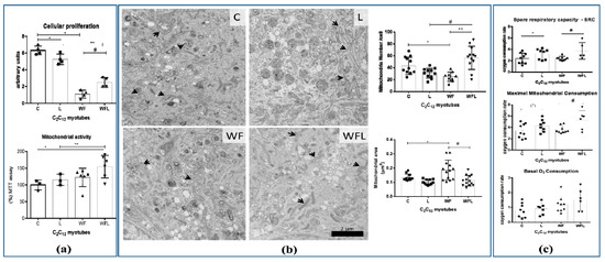 In in vitro assays with C2C12 myotubes, we observed that both groups treated with WF and WFL presented lower cell proliferation than groups C and L (Figure 3a). However, the leucine-supplemented medium improved this process showing that the WFL group had an enhanced cell proliferation in comparison to W group (Figure 3a). Although the Walker Factor induced lower cell proliferation, the mitochondria activity increased in leucine-treated groups (Figure 3a), which is corroborated by the higher proportion of mitochondria in C2C12 myotubes treated with leucine (ultrastructure images, and graphic showed in Figure 3b–transmission electron microscopy, mitochondria numbers and area). Oxygen consumption showed that leucine-treated C2C12 myotube presented a higher respiratory rate (maximal mitochondrial consumption and spare respiratory capacity) even under the presence of the Walker Factor (Figure 3c). These results indicated that leucine treatment could improve the oxygen consumption associated with an increased ATP production in association with an increased number of mitochondria (Figure 3b).