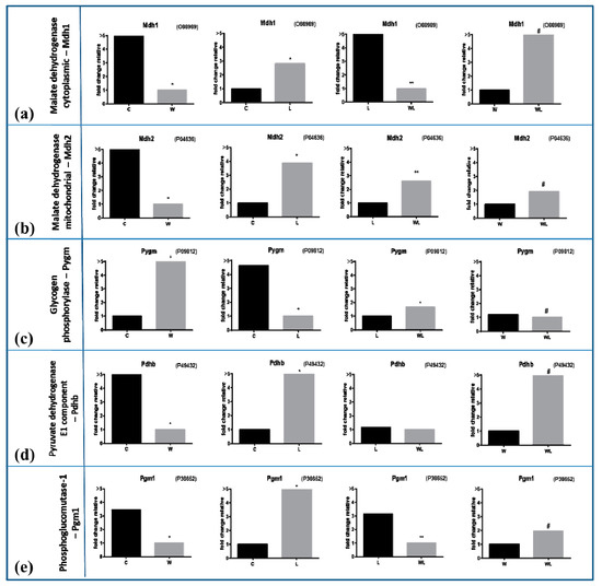 Muscle proteomic profile in all experimental groups subject or not to leucine-rich diet and bearing or not Walker-256 tumour. (a) malate dehydrogenase cytoplasmic—Mdh1, accession code O88989 and (b) malate dehydrogenase mitochondrial—Mdh2, accession code P04636 in gastrocnemius muscle under effects of Walker-tumour development and nutritional supplementation with leucine. (c) Glycogen phosphorylase—Pygm, accession code P09812 and (d) Pyruvate dehydrogenase E1 component—Pdhb, accession code P49432 in gastrocnemius muscle. (e) Phosphoglucomutase-1—Pgm1, accession code P38652 in gastrocnemius muscle. The values are expressed as the difference of maximal fold change. Legend: C, control group; W, Walker tumour-bearing group; L, rats fed a leucine-rich diet; WL, tumour-bearing rats fed a leucine-rich diet. * p < 0.05 difference against C group; ** p < 0.05 difference against L group: # p < 0.05 difference against WF group.