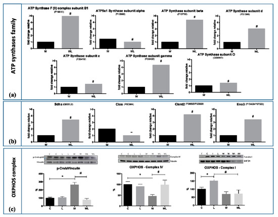Muscle mitochondrial proteins of all experimental groups subject or not to leucine-rich diet and bearing or not Walker-256 tumour. (a) ATP Synthases family: average concentrations of the ATP synthase complex subunit B1 (accession code P19511), subunit alpha (accession code P15999), subunit beta (accession code P10719), subunit d (accession code P31399), subunit e (accession code P29419), subunit gamma (accession code P35435) and subunit O (accession code Q06647). (b) Succinate dehydrogenase [ubiquinone] flavoprotein subunit—Sdha (accession code Q920L2); Creatine Kinase M-type, cytoplasmic—Ckm (accession code P00564); Creatine Kinase S-Type, mitochondrial—Ckmt2 (accession code P09605/P25809); Beta-Enolase—Eno3 (accession code P15429/P07323). (c) OXPHOS proteins of Western blot assay: Protein CREB phosphorylated (p-Creb: 43 kDa; loading control vinculin 124 kDa), OXPHOS—Complex IV (40 kDa; loading control tubulin 55 kDa) and OXPHOS—Complex I (20 kDa; loading control GAPDH 37 kDA) in gastrocnemius muscle. Western blot images represent the representative from each group. Legend: C, control group; W, Walker tumour-bearing group; L, rats fed a leucine-rich diet; WL, tumour-bearing rats fed a leucine-rich diet. * p < 0.05 difference against C group; ** p < 0.05 difference against L group: # p < 0.05 difference against WF group. Detailed information about Western blot can be found at Figure S1.