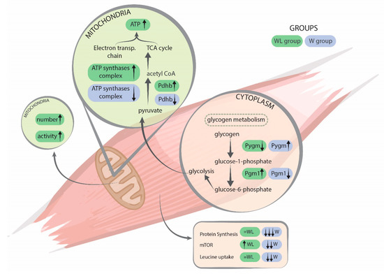 Illustration summarising the main processes found in both experimental groups. Legend: W, Walker tumour-bearing group, represented in blue; and WL, tumour-bearing rats fed a leucine-rich diet, represented in green colour. Arrows directions show the variation of the events between both groups. Glycogen phosphorylase (Pygm) is involved in muscle glycogenolysis and glycolysis. Phosphoglucomutase-1 (Pgm1) has a catalytic activity breakdown and synthesis of glucose. Pyruvate dehydrogenase E1 component (Pdhb) plays a role in the process of converting pyruvate to Acetyl-CoA. ATP synthases complex is for the production of ATP by the respiratory chain, mitochondrial function. Muscle protein synthesis and signalling events were published previously by Cruz and colleagues [51].