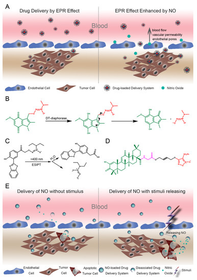 (A) Schematic illustration of the enhanced permeability and retention (EPR) effect by donated nitric oxide (NO). The donated NO can cause the endothelium-dependent relaxation of vascular smooth muscle, which will increase the blood flow and vascular permeability. Under this situation, the endothelial pores which serve as the gateway will be enlarged for particles and drugs; (B) Design of a DT-diaphorase-activated NO-donating agent; (C) Design of a photo-activated NO-donating agent; (D) Design of a transporter-mediated NO-donating agent; (E) Schematic illustration of nano-scaled NO delivery system with or without stimuli. Without stimulus, the NO-loaded delivery system will spontaneously release the NO in the normal tissue or tumor. For the stimuli-responsive delivery system, the release of NO can be controlled specifically by applying stimuli (e.g., ultrasound and light) at the tumor sites.