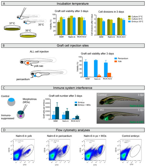 Successful B-cell precursor acute lymphoblastic leukemia (BCP-ALL) graft expansion in zebrafish embryos depends on graft site and host immunosuppression but not on temperature. (A). Viability and growth rate were flow cytometrically assessed for graft cells from groups of 10–20 zebrafish embryos at 35 °C or classical in vitro cultures at 35 °C and 37 °C from three or four independent experiments. (B). Graft cell viability was flow cytometrically assessed 3 days after injection into either the yolk sac (orange) or pericardium (blue). The two independent experiments performed for injections of Nalm-6 into the yolk sac compared to the four experiments with pericardium injections produced a significant difference, with a p-value of 0.007 in an unpaired t-test. Injections were performed in groups of 10–20 embryos. (C). Host embryos were immunosuppressed by morpholino (MO) injection into fertilized eggs (dark blue) and compared to untreated controls (light blue). Graft cell number per host embryo was calculated from flow cytometric analyses from groups of 10–20 embryos in three or four independent experiments. The comparisons of immunosuppressed injections with untreated controls produced p-values in a paired t-test: p = 0.045 for SEM cells, p = 0.095 for Nalm-6 cells and p = 0.049 for RCH-ACV cells. Bars represent means ± SEM. Microscopic images show 5-day old host embryos with (+MO) or without (control) immunosuppression 3 days post-injection (dpi) with DiO-labeled Nalm-6 cell injections into the pericardium. Only one biological replicate was performed for SEM and RCH-ACV injections into the yolk sac. Representative images shown. (D). Representative flowcytometric scatter plots of Nalm-6 cells following engraftment in zebrafish embryos. CD19 positive Nalm-6 cells prelabeled with CellTrace Violet can be separated from auto-fluorescent zebrafish cells to sort out the graft cell population for analysis. Engraftment site indicated as well as whether the host embryo was transiently immunosuppressed using morpholinos (MOs). Groups of 10 embryos from each treatment group were pooled before single-cell dissociation for flow cytometric analysis. Control embryos not engrafted show auto-fluorescence. For details see also Figure S1. Pc = pericardium.