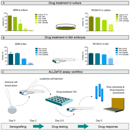 Optimized human–zebrafish xenograft (ALL-ZeFiX) assay reveals graft response to venetoclax (VTX) comparable to results from conventional in vitro treatment. (A). Viability of SEM and RCH-ACV cells treated for 48 h with indicated concentrations of venetoclax at 37 °C from two or three independent experiments in conventional 2D culture assessed by flow cytometry. (B). Viability of SEM and RCH-ACV cell grafts in immunosuppressed embryos treated with indicated concentrations of venetoclax at 35 °C for 72 h from three independent experiments assessed by flow cytometry. Each experiment was measured as the mean of a pool of 10–20 embryos. Bars represent means ± SEM. (C). Workflow is diagrammatically shown for the ALL-ZeFiX assay.